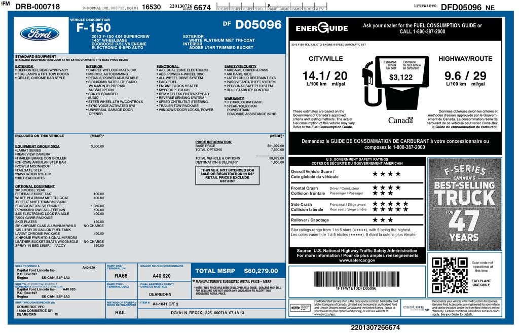 Dealer Inspection, A copy of the vehicle inspection is available upon request, Vehicle Detailed, Recent Oil Change, New Wiper Blades, 50/50 Powertrain: • 90 Day/3,000 Mile 50/50 Powertrain Guarantee • Vaughn will pay 50% of parts &, The rear defrost does not work. We did not diagnose the issue, 6-Speed Automatic Electronic, 4WD, Pale Adobe w/Leather-Trimmed Bucket Seats, 4 Speakers, ABS brakes, Adjustable pedals, Alloy wheels, Auto-dimming door mirrors, Auto-dimming Rear-View mirror, Automatic temperature control, Compass, Dual front impact airbags, Dual front side impact airbags, Electronic Stability Control, Front dual zone A/C, Front fog lights, Fully automatic headlights, GVWR: 7,350 lbs Payload Package, Heated door mirrors, Heated Front Seats, Illuminated entry, Low tire pressure warning, Memory seat, Overhead airbag, Overhead console, Pedal memory, Power door mirrors, Power passenger seat, Radio: AM/FM Stereo/Clock/Single-CD, Remote keyless entry, Security system, SiriusXM Satellite Radio, Speed control, Split folding rear seat, Steering wheel mounted audio controls, SYNC w/MyFord Touch, Tilt steering wheel, Traction control, Turn signal indicator mirrors. 3.5L V6 White Platinum Metallic Tri-Coat 2013 Ford F-150 Lariat Odometer is 15005 miles below market average!