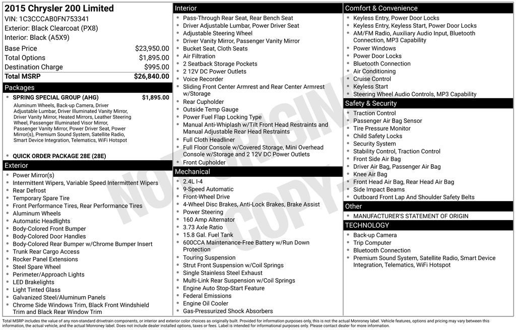 This 2015 Chrysler 200 Limited offers an exceptional blend of style, comfort, and efficiency. With its sleek black exterior and well-appointed interior, this vehicle is sure to turn heads wherever you go.