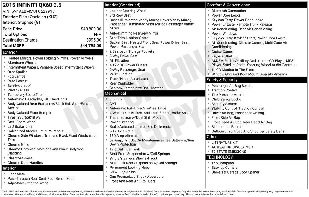 This 2015 INFINITI QX60 Base is an exceptional SUV that combines style, comfort, and performance. With its sleek black exterior and spacious 3-row interior, this QX60 is ready to take on your daily commute or weekend adventures.