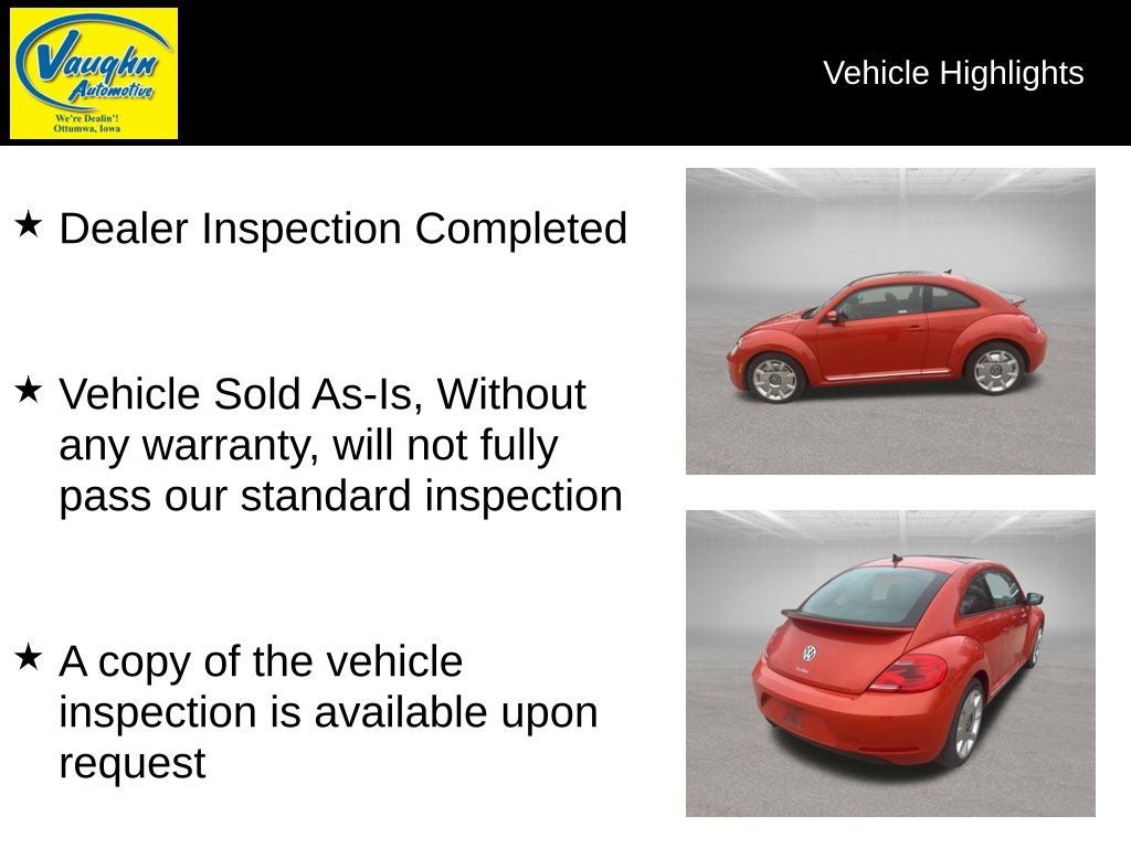 This Vehicle Has One or More Open Recalls, Ask Dealer for Details., 6-Speed Automatic, FWD, Titan Black w/V-Tex Leatherette Seating Surfaces. 1.8L 4-Cylinder Turbocharged DOHC Habanero Orange Metallic 2016 Volkswagen Beetle 25/34 City/Highway MPG