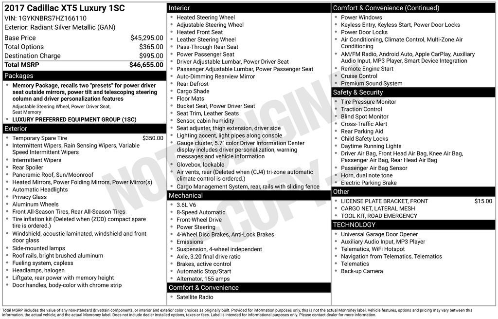 Certified. 1-Owner, Dealer Inspection Completed, A copy of the vehicle inspection is available upon request, Vehicle Detailed Inside and Out, Recent Oil Change Completed, New Wiper Blades Installed, Remote Start, 8-Speed Automatic, FWD, Jet Black w/Full Leather Seats w/Mini Perforated Inserts, 18 x 8 Bright Machined Finish Aluminum Wheels, 2-Way Power Driver Lumbar Control Seat Adjuster, 2-Way Power Passenger Lumbar Control Seat Adjuster, 8-Way Power Front Passenger Seat Adjuster, ABS brakes, Apple CarPlay/Android Auto, Auto-dimming door mirrors, Auto-dimming Rear-View mirror, Automatic Dual-Zone Climate Control, Bose Premium 8-Speaker Audio System Feature, Child-Seat-Sensing Airbag, Compass, Driver & Front Passenger Heated Seats, Dual front impact airbags, Dual front side impact airbags, Electronic Stability Control, Emergency communication system: OnStar Directions & Connections, Exterior Parking Camera Rear, Fully automatic headlights, Garage door transmitter, Heated door mirrors, Heated steering wheel, Low tire pressure warning, Memory seat, Occupant sensing airbag, Overhead airbag, Overhead console, Panic alarm, Power door mirrors, Power Liftgate, Power moonroof: UltraView, Power passenger seat, Premium audio system: Cadillac CUE, Radio: Cadillac CUE Info & Media Control System, Rain sensing wipers, Roof rack: rails only, SiriusXM Satellite Radio, Speed control, Split folding rear seat, Spoiler, Steering wheel memory, Steering wheel mounted audio controls, Telescoping steering wheel, Tilt steering wheel, Traction control. 3.6L V6 DI VVT Radiant Silver Metallic 2017 Cadillac XT5 Luxury 19/27 City/Highway MPG