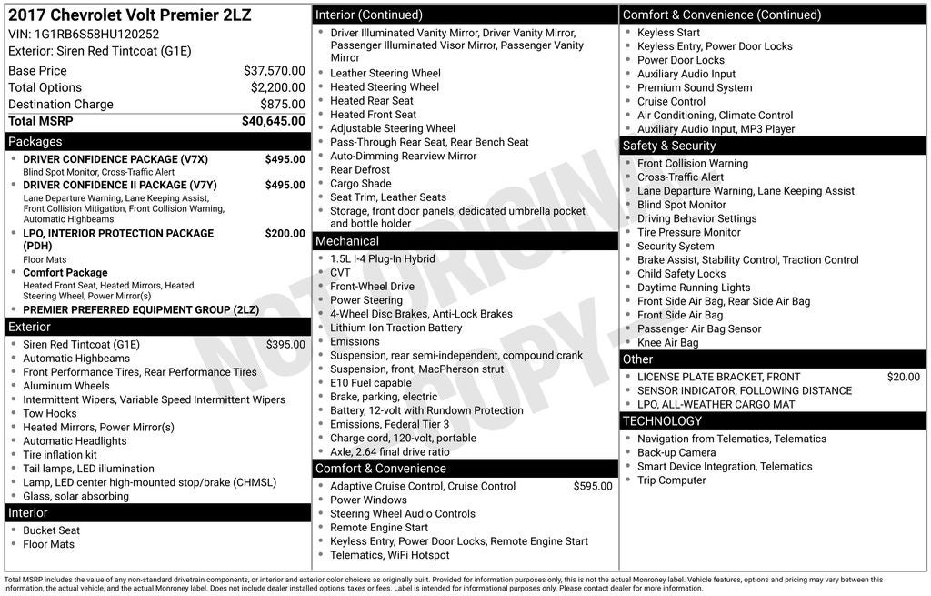 Dealer Inspection Completed, A copy of the vehicle inspection is available upon request, Vehicle Detailed Inside and Out, New Wiper Blades Installed, 50/50 Powertrain: • 90 Day/3,000 Mile 50/50 Powertrain Guarantee • Vaughn will pay 50% of parts &, 1.5L VVT DI DOHC 4-Cylinder Range Extender, 1-Speed Automatic, FWD, ABS brakes, Apple CarPlay, Auto-dimming Rear-View mirror, Automatic temperature control, Bose Premium 8-Speaker Audio System Feature, Dual front impact airbags, Dual front side impact airbags, Electronic Stability Control, Emergency communication system: OnStar Guidance, Exterior Parking Camera Rear, Fully automatic headlights, Heated Front Seats, Heated rear seats, Heated Steering Wheel, Knee airbag, Low tire pressure warning, Occupant sensing airbag, Outside temperature display, Overhead airbag, Overhead console, Power door mirrors, Radio: Chevrolet MyLink AM/FM Stereo, Rear side impact airbag, Rear window defroster, Remote keyless entry, Security system, SiriusXM Satellite Radio, Speed control, Split folding rear seat, Steering wheel mounted audio controls, Telescoping steering wheel, Tilt steering wheel, Traction control, Wheels: 17 x 7 Split 5-Spoke Aluminum. 1.5L VVT DI DOHC 4-Cylinder Range Extender Siren Red Tintcoat 2017 Chevrolet Volt Premier