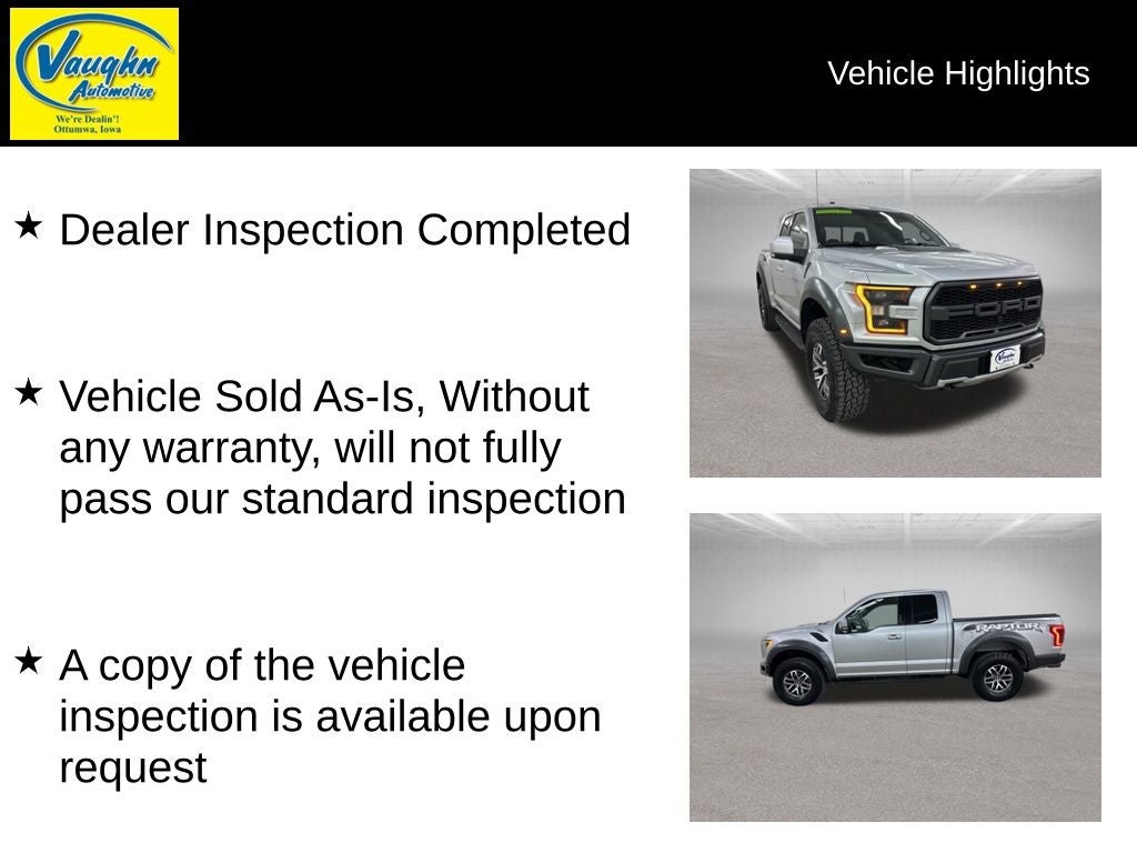 Dealer Inspection Completed, Vehicle Sold As-Is, Without any warranty, will not fully pass our standard inspection, A copy of the vehicle inspection is available upon request, Vehicle Detailed Inside and Out, Recent Oil Change Completed, New Wiper Blades Installed, Previous Owner Recently Replaced Tires, This vehicle runs, drives and shifts okay., The A/C and heater function properly and the electrical system works as designed., There is a moderate oil leak underneath the vehicle., The AutoCheck history report is clean., It has oil leaking from the pan and front cover seal, It has good brakes, Driver door window is cracked, 10-Speed Automatic, 4WD, Black Leather, 10-Way Power Driver & Passenger Seats, 17 Cast Aluminum Wheels, 360 Degree Camera, 4.10 Front Axle w/Torsen Differential, 7 Speakers, ABS brakes, Advanced Security Pack, Ambient Lighting, Auto-dimming Rear-View mirror, BLIS Blind Spot Information System, Dual front impact airbags, Dual front side impact airbags, Dual-Zone Electronic Automatic Temperature Control, Electronic Stability Control, Equipment Group 802A Luxury, Exterior Parking Camera Rear, Front Bucket Seats, Front fog lights, Fully automatic headlights, Heated/Cooled Leather 40/Console/40 Front Seats, Integrated Trailer Brake Controller, Intelligent Access w/Push-Button Start, LED Box Lighting, LED Side-Mirror Spotlights, Low tire pressure warning, Memory System (Seat, Pedal, Exterior Mirror), Occupant sensing airbag, Outside temperature display, Overhead airbag, Overhead console, Power Glass Heated Sideview Mirrors, Power Tilt/Telescoping Steering Column w/Memory, Power-Adjustable Pedals, Power-Sliding Rear Window, Pro Trailer Backup Assist, Radio: Sony Single CD w/HD & SiriusXM Satellite, Rear Parking Sensors, Remote keyless entry, Remote Start System w/Remote Tailgate Release, Speed control, Split folding rear seat, Steering wheel mounted audio controls, SYNC, SYNC Connect, Telescoping steering wheel, Tilt steering wheel, Traction control, Universal Garage Door Opener, Voice-Activated Navigation. 3.5L V6 Ingot Silver 2017 Ford F-150 Raptor
