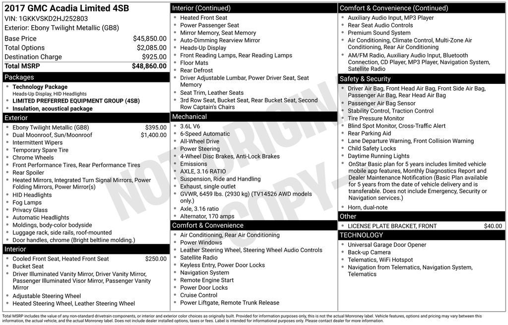 Certified. 1-Owner, Dealer Inspection Completed, A copy of the vehicle inspection is available upon request, Vehicle Detailed Inside and Out, Recent Oil Change Completed, New Wiper Blades Installed, 6-Speed Automatic, AWD, Ebony Leather, 2-Position Memory For Driver's Seat Adjuster, 3rd row seats: split-bench, 7-Passenger Seating (2-2-3 Seating Configuration), 8-Way Power Driver Seat w/Memory, 8-Way Power Passenger Seat Adjuster, ABS brakes, Auto-dimming door mirrors, Auto-dimming Rear-View mirror, Body-Color Bodyside Moldings, Bose Premium 10-Speaker Audio System, Cruise Control, Dual front impact airbags, Dual front side impact airbags, Dual SkyScape 2-Panel Power Sunroof, Electronic Stability Control, Emergency communication system: OnStar Guidance, Exterior Parking Camera Rear, Front fog lights, Front Halogen Projector Beam Fog Lamps, Fully automatic headlights, Garage door transmitter, Heads-Up Display, Heated & Cooled Front Seats, Heated Leather Wrapped Steering Wheel, Heated Power-Adjustable Outside Mirrors, High-Intensity Discharge Headlights, Inside Rear-View Auto-Dimming Mirror, Leather-Wrapped Steering Wheel, Low tire pressure warning, Memory seat, Navigation System, NavTraffic, Occupant sensing airbag, Overhead airbag, Overhead console, Power passenger seat, Power Rear Liftgate Body, Power Windows w/Driver Express-Up & -Down, Preferred Equipment Group 4SB, Radio: Color Touch Navigation w/IntelliLink, Rear Audio System Controls, Rear Parking Sensors, Remote Vehicle Start, Security system, Side Blind Zone Alert & Rear Cross Traffic Alert, Single Outlet Exhaust, SiriusXM Satellite Radio, Steering Wheel Mounted Audio Controls, Tilt & Telescopic Steering Column, Tilt steering wheel, Traction control, Tri-Zone Automatic Climate Control, Turn signal indicator mirrors, Universal Home Remote, Variable Effort Power Steering, Wheels: 20 x 7.5 Chrome-Clad Aluminum (4). 3.6L V6 SIDI Ebony Twilight Metallic 2017 GMC Acadia Limited Limited Priced below KBB Fair Purchase Price!