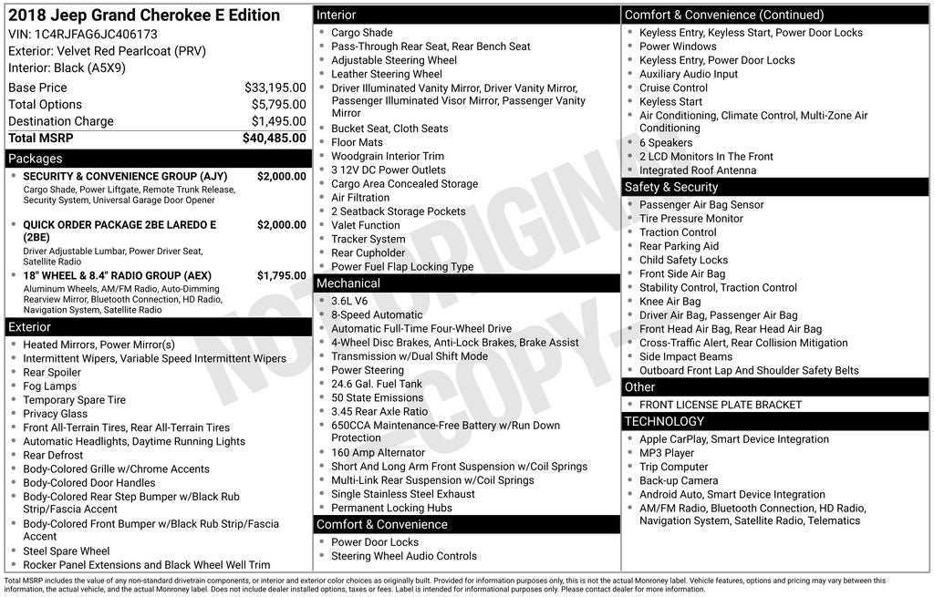 Dealer Inspection, A copy of the vehicle inspection is available upon request, Vehicle Detailed, Recent Oil Change, New Wiper Blades, Vaughn Powertrain Coverage: • 90 Day/3,000 Mile Powertrain Limited Warranty • 165-Point Inspection, Garage door transmitter, 3.6L V6 24V VVT, 8-Speed Automatic, 4WD, Velvet Red Pearlcoat, 115V Auxiliary Power Outlet, 6 Speakers, 8.4 Touchscreen Display, ABS brakes, AM/FM radio, Anti-whiplash front head restraints, Apple CarPlay/Android Auto, Auto-Dimming Rear-View Mirror, Automatic temperature control, Bright Side Roof Rails, Dual front impact airbags, Dual front side impact airbags, Electronic Stability Control, Front dual zone A/C, Front fog lights, Fully automatic headlights, GPS Navigation, Heated door mirrors, Heated Front Seats, Heated Steering Wheel, Integrated Voice Command w/Bluetooth®, Knee airbag, Low tire pressure warning, Occupant sensing airbag, Overhead airbag, Overhead console, ParkView Rear Back-Up Camera, Power 4-Way Driver Lumbar Adjust, Power 8-Way Driver/Manual Passenger Seat, Power door mirrors, Power Liftgate, Quick Order Package 2BE Laredo E, Radio: Uconnect 4 w/7 Display, Rear window defroster, Remote keyless entry, Remote Start System, Security & Convenience Group, Security Alarm, SiriusXM Satellite Radio, Speed control, Speed-Sensitive Wipers, Split folding rear seat, Steering Wheel Mounted Audio Controls, Steering wheel mounted audio controls, Telescoping steering wheel, Tilt steering wheel, Traction control, Universal Garage Door Opener, Wheels: 18 x 8.0 Tech Gray Aluminum. 3.6L V6 24V VVT Velvet Red Pearlcoat 2018 Jeep Grand Cherokee Laredo E