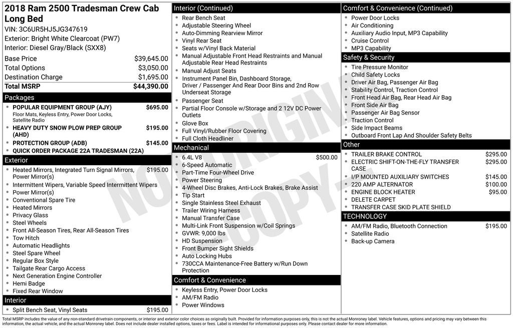 Certified. 1-Owner, Dealer Inspection, A copy of the vehicle inspection is available upon request, Vehicle Detailed, Recent Oil Change, New Wiper Blades, It has some random minor body issues. It is priced per condition., 6-Speed Automatic, 4WD, Diesel Gray/Black Vinyl, 1-Yr SiriusXM Radio Service, 17 x 7.5 Steel Styled Wheels, ABS brakes, Air Conditioning, AM/FM radio, Auto-dimming Rear-View mirror, Black Exterior Mirrors, Center Hub, Dual front impact airbags, Dual front side impact airbags, Electric Shift-On-The-Fly Transfer Case, Electronic Stability Control, Engine Block Heater, Exterior Mirrors Courtesy Lamps, Exterior Mirrors w/Heating Element, Exterior Mirrors w/Supplemental Signals, For More Info, Call 800-643-2112, Fully automatic headlights, Heavy Duty Snow Plow Prep Group, Heavy Duty Vinyl 40/20/40 Split Bench Seat, I/P Mounted Auxiliary Switches, Integrated Voice Command w/Bluetooth®, Low tire pressure warning, Occupant sensing airbag, Overhead airbag, ParkView Rear Back-Up Camera, Power Black Trailer Tow Mirrors, Radio: Uconnect 3.0 w/5 Display, Rear Folding Seat, Remote Keyless Entry, SiriusXM Satellite Radio, Speed control, Storage Tray, Tilt steering wheel, Tip Start, Traction control, Trailer Brake Control, Trailer Tow Mirrors. 6.4L Heavy Duty V8 HEMI w/MDS Bright White Clearcoat 2018 Ram 2500 Tradesman Priced below KBB Fair Purchase Price! Odometer is 14801 miles below market average!