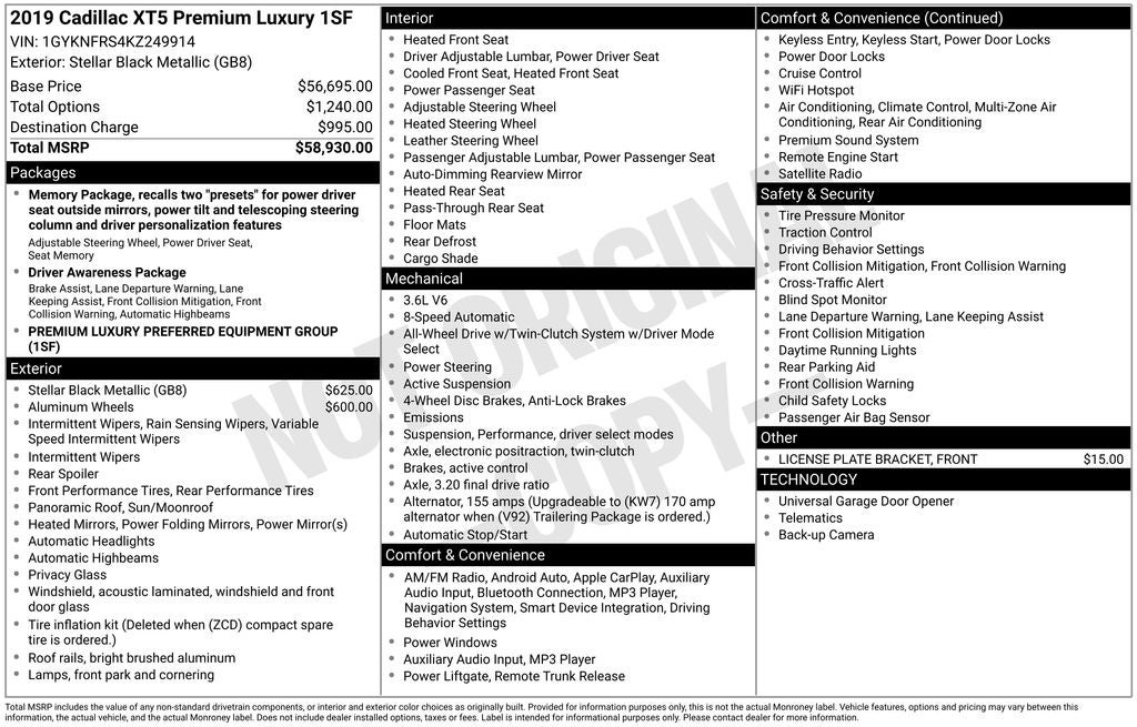 Certified. Balance of Factory Warranty, Dealer Inspection Completed, A copy of the vehicle inspection is available upon request, Vehicle Detailed Inside and Out, Recent Oil Change Completed, New Wiper Blades Installed, Remote Start, 8-Speed Automatic, AWD, Black Leather, 155 Amp Alternator, 2-Way Power Driver Lumbar Control Seat Adjuster, 2-Way Power Passenger Lumbar Control Seat Adjuster, 8-Way Power Front Passenger Seat Adjuster, ABS brakes, Adaptive suspension, Apple CarPlay/Android Auto, Auto High-beam Headlights, Auto-dimming door mirrors, Auto-dimming Rear-View mirror, Automatic temperature control, Body-Color Heated Power-Adjustable Outside Mirrors, Bose Studio Surround Sound w/14 Speakers, Dual front impact airbags, Dual front side impact airbags, Electronic Stability Control, Emergency communication system: OnStar and Cadillac connected services capable, Exterior Parking Camera Rear, Front & Rear Park Assist, Front dual zone A/C, Fully automatic headlights, Garage door transmitter, Heated door mirrors, Heated Front Seats, Heated Rear Outboard Seating Positions, Heated steering wheel, Knee airbag, Low Speed Forward Automatic Braking, Low tire pressure warning, Memory seat, Navigation System, Occupant sensing airbag, Overhead airbag, Overhead console, Panic alarm, Performance Suspension, Power door mirrors, Power Liftgate, Power moonroof: UltraView, Premium Luxury Package 1SF, Radio: Cadillac User Experience w/Embedded Nav, Rain sensing wipers, Rear air conditioning, SiriusXM Radio, Speed control, Split folding rear seat, Spoiler, Steering wheel memory, Steering wheel mounted audio controls, Teen Driver, Telescoping steering wheel, Tilt steering wheel, Traction control, Ventilated Driver & Front Passenger Seats, Wheels: 20 x 8 12-Spoke Fully Polished. 3.6L V6 DI VVT Stellar Black Metallic 2019 Cadillac XT5 Premium Luxury Odometer is 5765 miles below market average!
