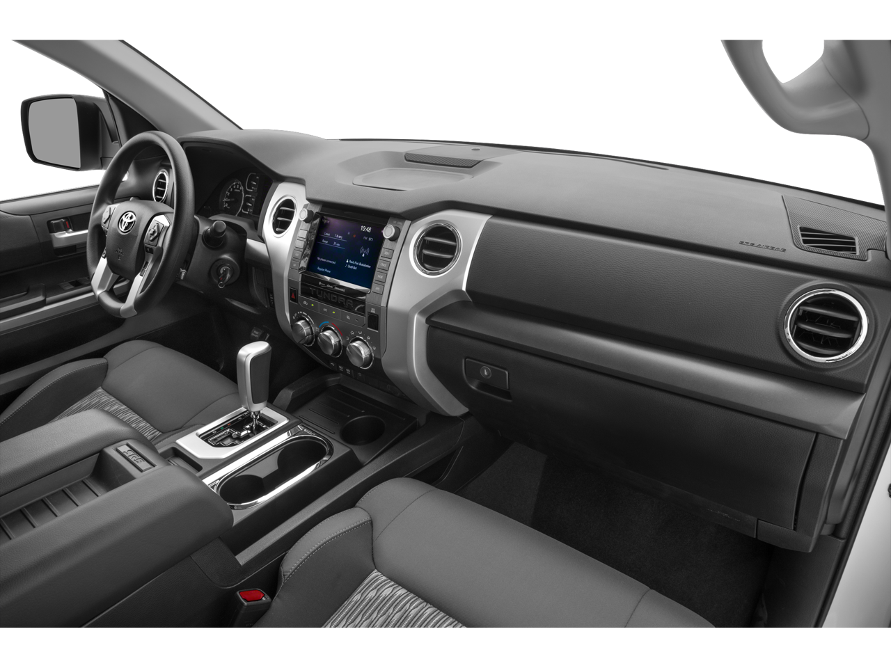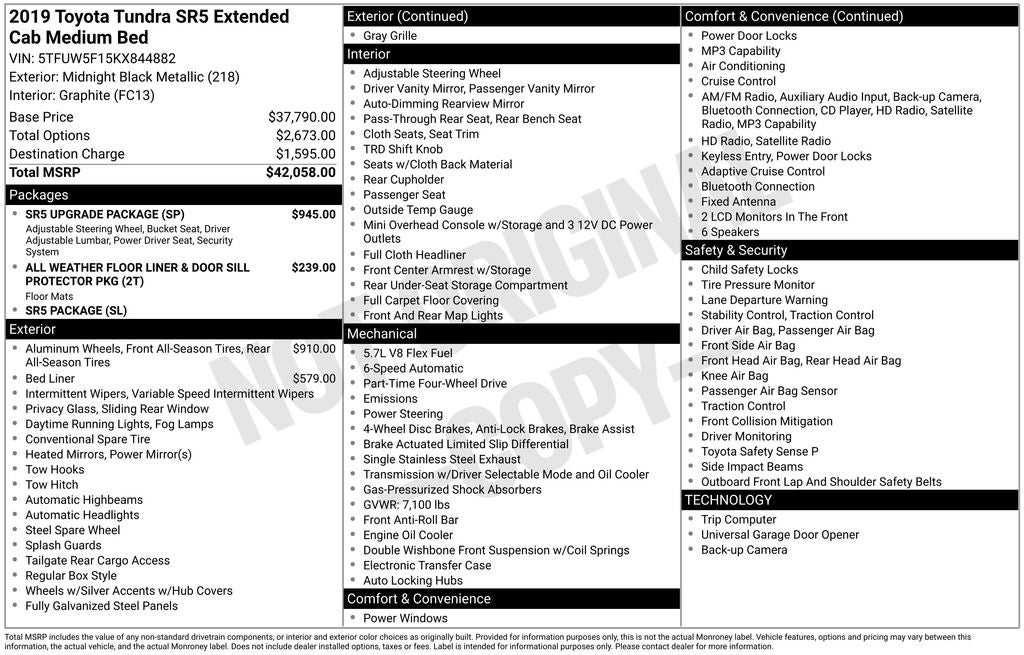 1-Owner, Dealer Inspection Completed, A copy of the vehicle inspection is available upon request, Vehicle Detailed Inside and Out, Recent Oil Change Completed, New Wiper Blades Installed, 50/50 Powertrain: • 90 Day/3,000 Mile 50/50 Powertrain Guarantee • Vaughn will pay 50% of parts &, THE BODY HAS RANDOM DENTS AND DINGS. IT IS PRICED ACCORDINGLY, It has rear suspension airbags, 6-Speed Automatic Electronic, 4WD, Graphite w/Fabric Seat Trim or Fabric Seat Trim w/TRD Off Road Package, 18 x 8J Styled Steel Wheels, 3-Passenger Front Bench Seat, 6 Speakers, ABS brakes, Air Conditioning, Auto High-beam Headlights, Auto-Dimming Rear-View Mirror, Compass, Dual front impact airbags, Dual front side impact airbags, Electronic Stability Control, Exterior Parking Camera Rear, Front Center Armrest w/Storage, Front Fog & Daytime Running Lights, Front fog lights, Fully automatic headlights, Garage door transmitter: HomeLink, Heated door mirrors, HomeLink Universal Transceiver, Knee airbag, Low tire pressure warning, Occupant sensing airbag, Outside temperature display, Overhead airbag, Overhead console, Panic alarm, Power door mirrors, Radio: Entune Audio Plus AM/FM/HD Radio w/CD, Remote keyless entry, SIRIUSXM Satellite Radio, Speed control, Split folding rear seat, Tilt steering wheel, Traction control, TRD Shift Knob. i-Force 5.7L V8 Flex Fuel DOHC 32V LEV Midnight Black Metallic 2019 Toyota Tundra SR5