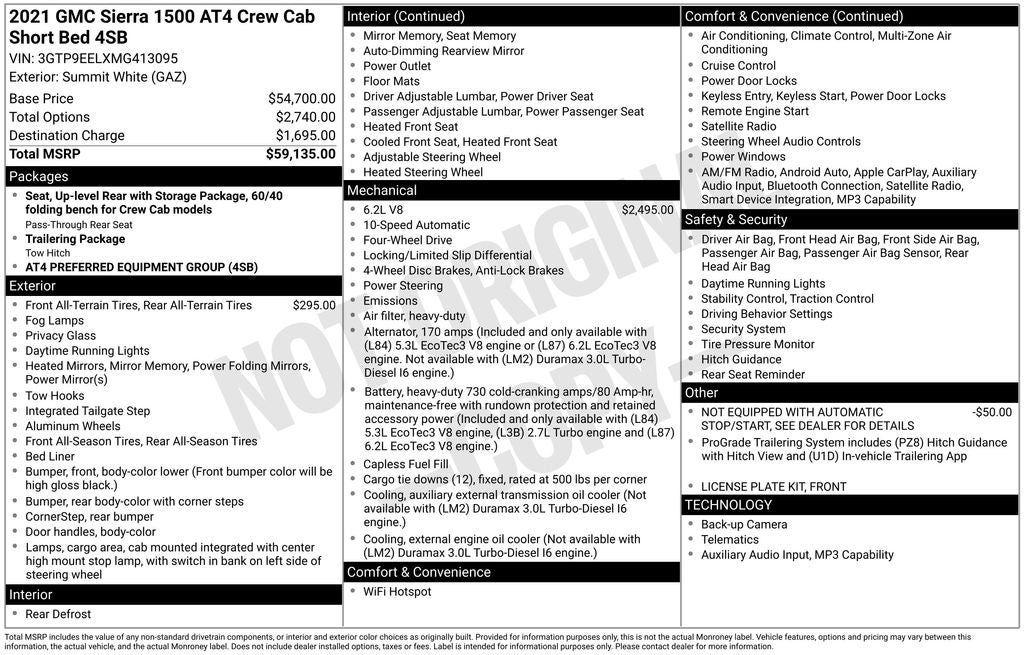 Certified. 1-Owner, Balance of Factory Warranty, Dealer Inspection Completed, A copy of the vehicle inspection is available upon request, Vehicle Detailed Inside and Out, Recent Oil Change Completed, New Wiper Blades Installed, 10-Speed Automatic, 4WD, Jet Black w/Perf Leather-Appointed Front Outboard Seat Trim, 10-Way Power Driver Seat Adjuster w/Lumbar, 10-Way Power Passenger Seat Adjuster w/Lumbar, 12-Volt Rear Auxiliary Power Outlet, 120-Volt Bed Mounted Power Outlet, 120-Volt Instrument Panel Power Outlet, 170 Amp Alternator, 18 x 8.5 Machined Aluminum Wheels, 2 USB Ports, 2 USB Ports (1st Row), 4.2 Diagonal Color Display Driver Info Center, 4G LTE Wi-Fi Hotspot Capable, 6-Speaker Audio System Feature, ABS brakes, AM/FM radio: SiriusXM with 360L, Apple CarPlay/Android Auto, Auto-dimming door mirrors, Auto-dimming Rear-View mirror, Auto-Locking Rear Differential, Automatic temperature control, Auxiliary External Transmission Oil Cooler, Body-Color Surround Grille, Color-Keyed Carpeting Floor Covering, Compass, Deep-Tinted Glass, Driver Memory, Dual front impact airbags, Dual front side impact airbags, Electric Rear-Window Defogger, Electrical Lock Control Steering Column, Electronic Stability Control, Floor-Mounted Center Console, Front dual zone A/C, Front fog lights, Front Prem Floor Liners w/Removable Carpet Insert, Fully automatic headlights, GMC Connected Access Capable, HD Rear Vision Camera, Heated 2nd Row Outboard Seats, Heated door mirrors, Heated Driver & Front Outboard Passenger Seating, Heated steering wheel, Heavy-Duty Air Filter, Hill Descent Control, Hitch Guidance w/Hitch View, In-Vehicle Trailering App, Integrated Trailer Brake Controller, Keyless Open & Start, LED Cargo Area Lighting, Low tire pressure warning, Manual Tilt-Wheel & Telescoping Steering Column, Occupant sensing airbag, Off-Road Suspension, OnStar & GMC Connected Services Capable, Outside temperature display, Overhead airbag, Overhead console, Power Door Locks, Power door mirrors, Power Front Passenger Windows w/Express Up/Down, Power Front Windows w/Driver Express Up/Down, Power Rear Windows w/Express Down, Preferred Equipment Group 4SB, Premium audio system: GMC Infotainment System, ProGrade Trailering System, Radio: Premium GMC Infotainment Sys w/Multi-Touch, Rear Dual USB Charging-Only Ports, Rear Wheelhouse Liners, Red Recovery Hooks, Remote Vehicle Starter System, SiriusXM w/360L, Speed control, Split folding rear seat, Spray-On Pickup Bed Liner w/AT4 Logo, Steering Wheel Audio Controls, Telescoping steering wheel, Theft Deterrent System (Unauthorized Entry), Tilt steering wheel, Traction control, Trailering Package, Ventilated Driver & Front Passenger Seats. EcoTec3 6.2L V8 Summit White 2021 GMC Sierra 1500 AT4 Priced below KBB Fair Purchase Price! Odometer is 24718 miles below market average!