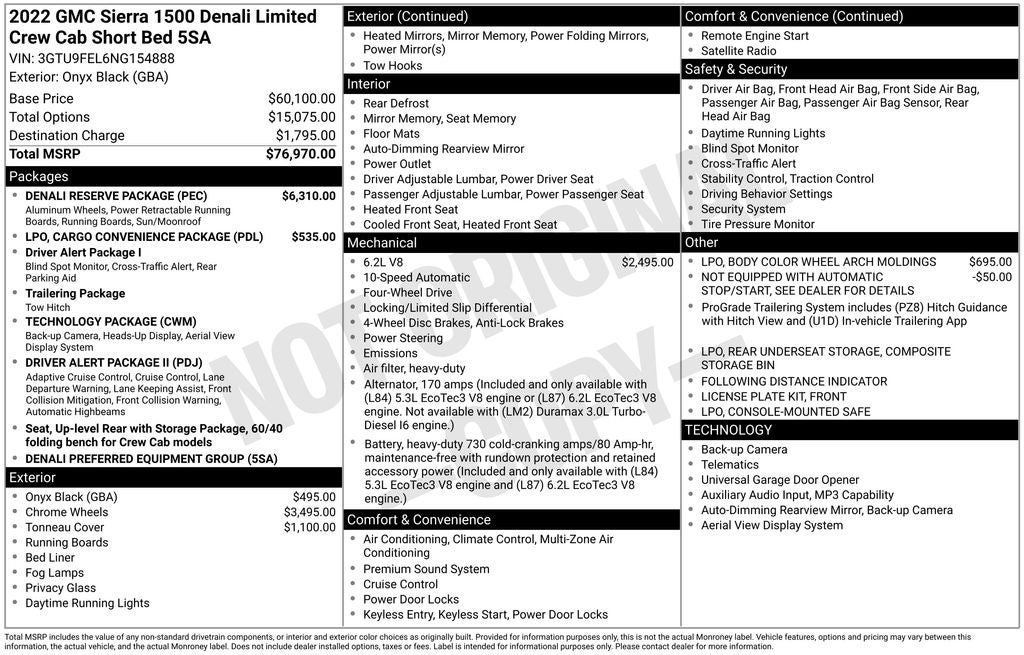 Certified. 1-Owner, Dealer Inspection Completed, A copy of the vehicle inspection is available upon request, Vehicle Detailed Inside and Out, Recent Oil Change Completed, 10-Speed Automatic, 4WD, Dark Walnut/Dark Ash Grey Leather, 10-Way Power Driver Seat Adjuster w/Lumbar, 10-Way Power Passenger Seat Adjuster w/Lumbar, 12-Volt Rear Auxiliary Power Outlet, 120-Volt Bed Mounted Power Outlet, 120-Volt Instrument Panel Power Outlet, 170 Amp Alternator, 2 USB Ports, 2 USB Ports (1st Row), ABS brakes, Adaptive Cruise Control, Adaptive Ride Control Suspension, Apple CarPlay/Android Auto, Auto-dimming door mirrors, Auto-dimming Rear-View mirror, Auto-Locking Rear Differential, Automatic Emergency Braking, Automatic temperature control, Auxiliary External Transmission Oil Cooler, Bed View Camera, Cargo Convenience Package, Chrome Recovery Hooks, Chrome Wheel To Wheel Assist Steps, Color-Keyed Carpeting Floor Covering, Compass, Console-Mounted Safe (LPO), Deep-Tinted Glass, Denali Reserve Package, Driver Alert Package I, Driver Alert Package II, Driver Memory, Dual front impact airbags, Dual front side impact airbags, Electronic Stability Control, Floor-Mounted Center Console, Following Distance Indicator, Forward Collision Alert, Front dual zone A/C, Front fog lights, Front Pedestrian Braking, Fully automatic headlights, Garage door transmitter, GMC Connected Access Capable, GMC MultiPro Power Steps, Hard-Folding Tonneau Cover (LPO), HD Rear Vision Camera, HD Surround Vision w/2 Trailer View Camera Provisions, Heated door mirrors, Heated Driver & Front Outboard Passenger Seating, Heated steering wheel, Heavy-Duty Air Filter, Hill Descent Control, Hitch Guidance w/Hitch View, In-Vehicle Trailering App, Integrated Trailer Brake Controller, IntelliBeam Automatic High Beam On/Off, Keyless Open & Start, Lane Change Alert w/Side Blind Zone Alert, Lane Keep Assist w/Lane Departure Warning, LED Cargo Area Lighting, Low tire pressure warning, Manual Tilt-Wheel & Telescoping Steering Column, Multicolor 15 Diagonal Head-Up Display, Navigation System, Occupant sensing airbag, OnStar & GMC Connected Services Capable, Overhead airbag, Overhead console, Power Door Locks, Power door mirrors, Power Front Passenger Windows w/Express Up/Down, Power Front Windows w/Driver Express Up/Down, Power Rear Windows w/Express Down, Power Sliding Rear Window w/Rear Defogger, Power Sunroof, Preferred Equipment Group 5SA, Premium Bose 7-Speaker Sound System, ProGrade Trailering System, Radio: Premium GMC Infotainment Sys w/Navigation, Rear Camera Mirror, Rear Cross Traffic Alert, Rear Dual USB Charging-Only Ports, Rear Underseat Storage (LPO), Rear Wheelhouse Liners, Remote Vehicle Starter System, Safety Alert Seat, Signature Denali Grille, SiriusXM w/360L, Split folding rear seat, Spray-On Pickup Bed Liner w/Denali Logo, Steering Wheel Audio Controls, Technology Package, Telescoping steering wheel, Theft Deterrent System (Unauthorized Entry), Tilt steering wheel, Traction control, Trailering Package, Ultrasonic Front & Rear Park Assist, Universal Home Remote, Ventilated Driver & Front Passenger Seats, Wheels: 22 x 9 Multi-Dimensional Polished Alum, Wi-Fi Hotspot Capable, Wireless Charging. EcoTec3 6.2L V8 Onyx Black 2022 GMC Sierra 1500 Limited Denali