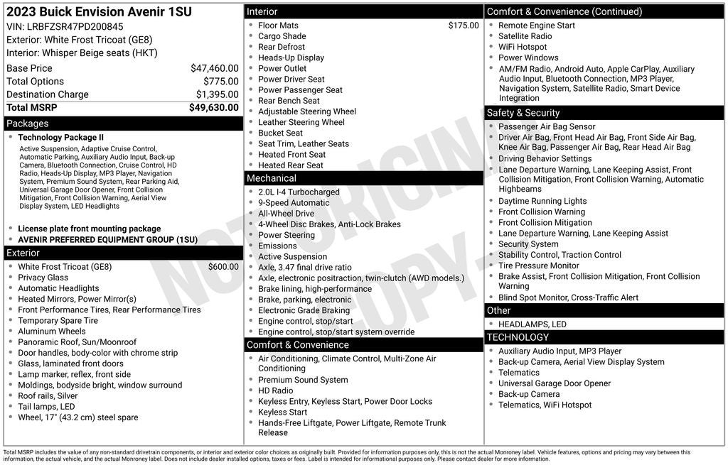 1-Owner, Balance of Factory Warranty, Dealer Inspection Completed, A copy of the vehicle inspection is available upon request, Vehicle Detailed Inside and Out, Recent Oil Change Completed, New Wiper Blades Installed, Remote Start, Factory Warranty: • Balance of remaining bumper to bumper factory warranty •, 9-Speed Automatic, AWD, Whisper Beige Seats Leather, 8-Way Power Driver Seat Adjuster, ABS brakes, Apple CarPlay/Android Auto, Auto High-beam Headlights, Auto-dimming door mirrors, Auto-dimming Rear-View mirror, Automatic temperature control, Bose Premium 9-Speaker Audio System Feature, Dual front impact airbags, Dual front side impact airbags, Electronic Stability Control, Emergency communication system: OnStar and Buick connected services capable, Exterior Parking Camera Rear, Following Distance Indicator, Forward Collision Alert, Front Bin Center Console USB Ports, Front dual zone A/C, Front Pedestrian Braking, Fully automatic headlights, Garage door transmitter, HD Radio, Heads-Up Display, Heated door mirrors, Heated Driver & Front Passenger Seats, Heated Rear Outboard Seating Positions, Heated steering wheel, IntelliBeam Headlamp Control w/Auto High Beam, Knee airbag, Lane Keep Assist w/Lane Departure Warning, Low tire pressure warning, Memory Card Receptacle Audio System Feature, Memory seat, Navigation System, Occupant sensing airbag, Overhead airbag, Power door mirrors, Power Liftgate, Power moonroof, Power passenger seat, Radio: Buick Infotainment System AM/FM w/Nav, Security system, SiriusXM Radio, Speed control, Split folding rear seat, Steering wheel mounted audio controls, Telescoping steering wheel, Tilt steering wheel, Traction control, USB Charging-Only Ports, Ventilated Driver & Front Passenger Seats, Wheels: 20 Aluminum w/Avenir Pearl Nickel Finish, Wireless Apple CarPlay/Wireless Android Auto. 2.0L Turbocharged White Frost Tricoat 2023 Buick Envision Avenir 22/29 City/Highway MPG