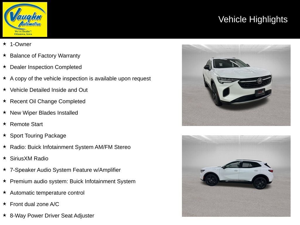 Certified. 1-Owner, Balance of Factory Warranty, Dealer Inspection Completed, A copy of the vehicle inspection is available upon request, Vehicle Detailed Inside and Out, Recent Oil Change Completed, New Wiper Blades Installed, Remote Start, Envision Essence, 9-Speed Automatic, FWD, Ebony w/Ebony Accents w/Front Bucket Seats, 7-Speaker Audio System Feature w/Amplifier, 8-Way Power Driver Seat Adjuster, ABS brakes, Apple CarPlay/Android Auto, Auto High-beam Headlights, Auto-dimming door mirrors, Auto-dimming Rear-View mirror, Automatic temperature control, Black Roof Rails, Body-Color Door Handles, Carpeted Front & Rear Floor Mats, Compass, Dual front impact airbags, Dual front side impact airbags, Electronic Stability Control, Emergency communication system: OnStar and Buick connected services capable, Following Distance Indicator, Forward Collision Alert, Front Bin Center Console USB Ports, Front dual zone A/C, Front Pedestrian Braking, Fully automatic headlights, Heated door mirrors, Heated Driver & Front Passenger Seats, Heated steering wheel, IntelliBeam Headlamp Control w/Auto High Beam, Knee airbag, Lane Keep Assist w/Lane Departure Warning, Low tire pressure warning, Lower Trim/Wheel Arch Moldings, Memory seat, Occupant sensing airbag, Outside temperature display, Overhead airbag, Overhead console, Power door mirrors, Power Liftgate, Power Panoramic Tilt-Sliding Moonroof, Power passenger seat, Premium audio system: Buick Infotainment System, Radio: Buick Infotainment System AM/FM Stereo, Security system, SiriusXM Radio, Speed control, Split folding rear seat, Sport Alloy Pedals, Sport Touring Package, Steering wheel mounted audio controls, Telescoping steering wheel, Tilt steering wheel, Traction control, USB Charging-Only Ports, Wheels: 20 Aluminum w/Dark Finish, Wireless Apple CarPlay/Wireless Android Auto. 2.0L Turbocharged Summit White 2023 Buick Envision Essence 23/31 City/Highway MPG