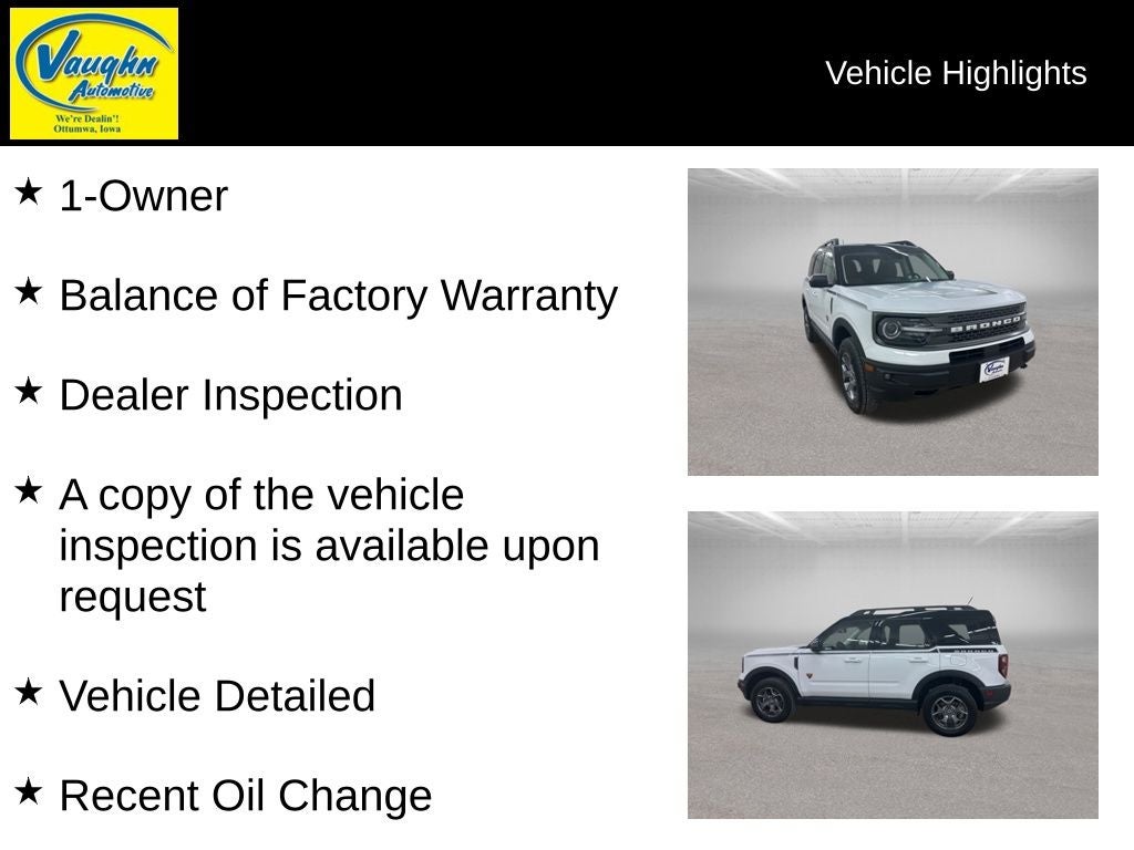1-Owner, Balance of Factory Warranty, Dealer Inspection, A copy of the vehicle inspection is available upon request, Vehicle Detailed, Recent Oil Change, New Wiper Blades, Remote Start, Factory Warranty: • Balance of remaining bumper to bumper factory warranty •, 8-Speed Automatic, 4WD, Ebony/Roast w/Leather Trimmed Heated Sport Contour Bucket Seats, 6 Speakers, ABS brakes, AM/FM radio: SiriusXM, Auto High-beam Headlights, Automatic temperature control, Compass, Dual front impact airbags, Dual front side impact airbags, Electronic Stability Control, Emergency communication system: SYNC 3 911 Assist, Front Bucket Seats, Front fog lights, Fully automatic headlights, Heated door mirrors, Heated Front Seats, Knee airbag, Low tire pressure warning, Occupant sensing airbag, Overhead airbag, Overhead console, Power door mirrors, Power driver seat, Rear window defroster, Security system, Speed control, Speed-Sensitive Wipers, Split folding rear seat, Steering wheel mounted audio controls, SYNC 3 Communications & Entertainment System, SYNC 3/Apple CarPlay/Android Auto, Telescoping steering wheel, Tilt steering wheel, Traction control, Wheels: 17 Carbonized Gray-Painted Aluminum. EcoBoost 2.0L I4 GTDi DOHC Turbocharged VCT Oxford White 2023 Ford Bronco Sport Badlands Odometer is 3514 miles below market average! 21/26 City/Highway MPG