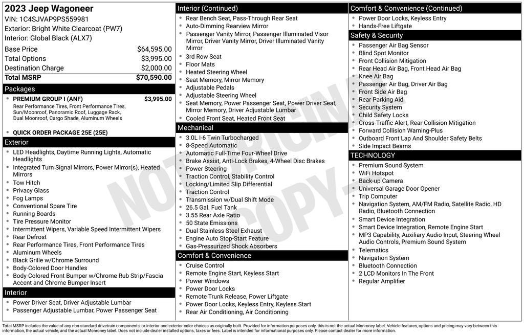This 2023 Jeep Wagoneer Base is a certified pre-owned vehicle, giving you the peace of mind of a comprehensive inspection and warranty coverage. With its powerful 3.0L I6 engine and 4WD capabilities, this Wagoneer is ready to tackle any adventure, whether it's hauling your family or exploring the great outdoors. The spacious interior and premium features, including a 3-panel sunroof, ventilated front seats, and a premium audio system, make this Wagoneer a true luxury SUV.