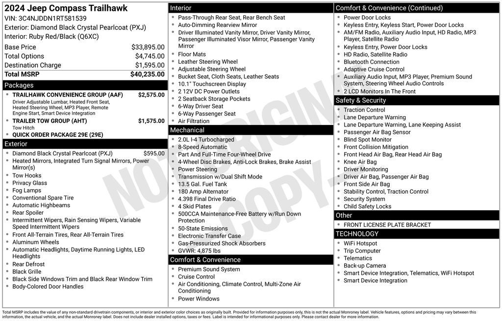 This 2024 Jeep Compass Trailhawk is a capable and well-equipped SUV that's ready to take on any adventure. Powered by a 2.0L I4 DOHC engine and equipped with 4WD, it delivers an impressive 24 city / 32 highway MPG, making it both efficient and capable.